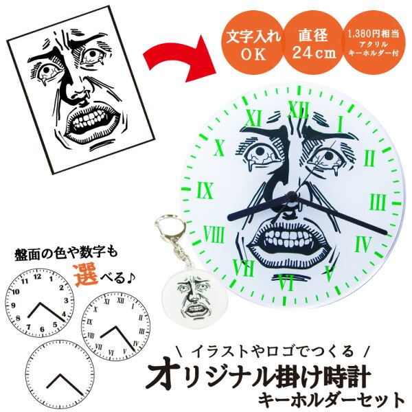 ◆時計部分 アクリル 直径約240mm 厚さ約5mm ◆時計部分 SEIKO製 単3電池1本使用(別売り) ◆アクリルキーホルダー1個 アクリル サイズ(約):40mm×40mm 厚さ約3mm キーホルダーのタイプはお選びいただけます(2重リング・ナスカン・ボールチェーン) オリジナル掛け時計は、大切な方への贈り物や記念品にぴったり! おじいちゃんやおばあちゃん、家族へのプレゼントに! 個人も企業様もOK。
